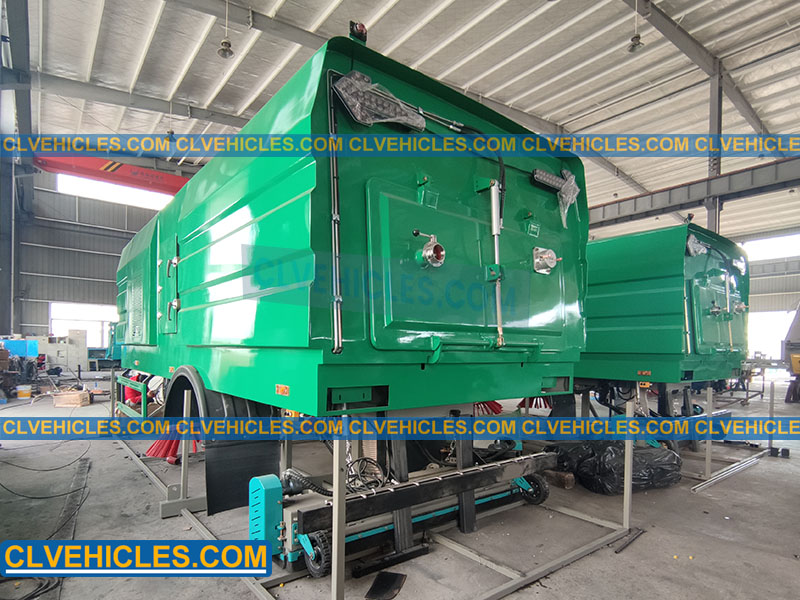 Configuração da superestrutura: 3 tanques de água cúbicos + 7 tanques de poeira cúbicos, todos em aço inoxidável 304, motor auxiliar Cummins 140hp, 2 escovas de varredura montadas no meio, sucção traseira com escova giratória, interruptor de controle Siemens.